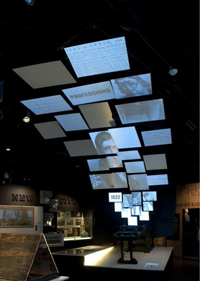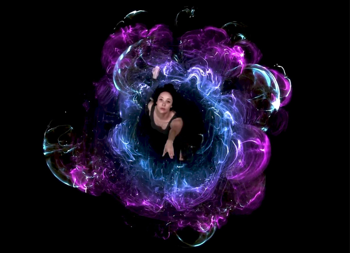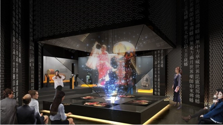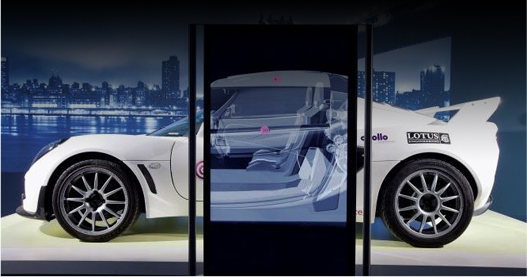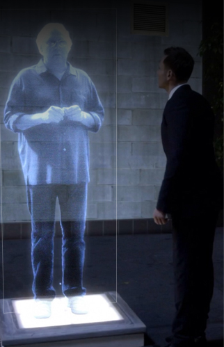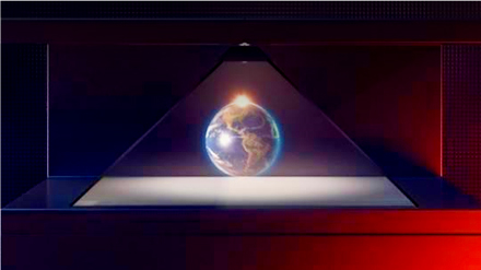采用投影仪或其他显示方法,将光源折射45度成像在幻影成像膜上,称之为全息投影。